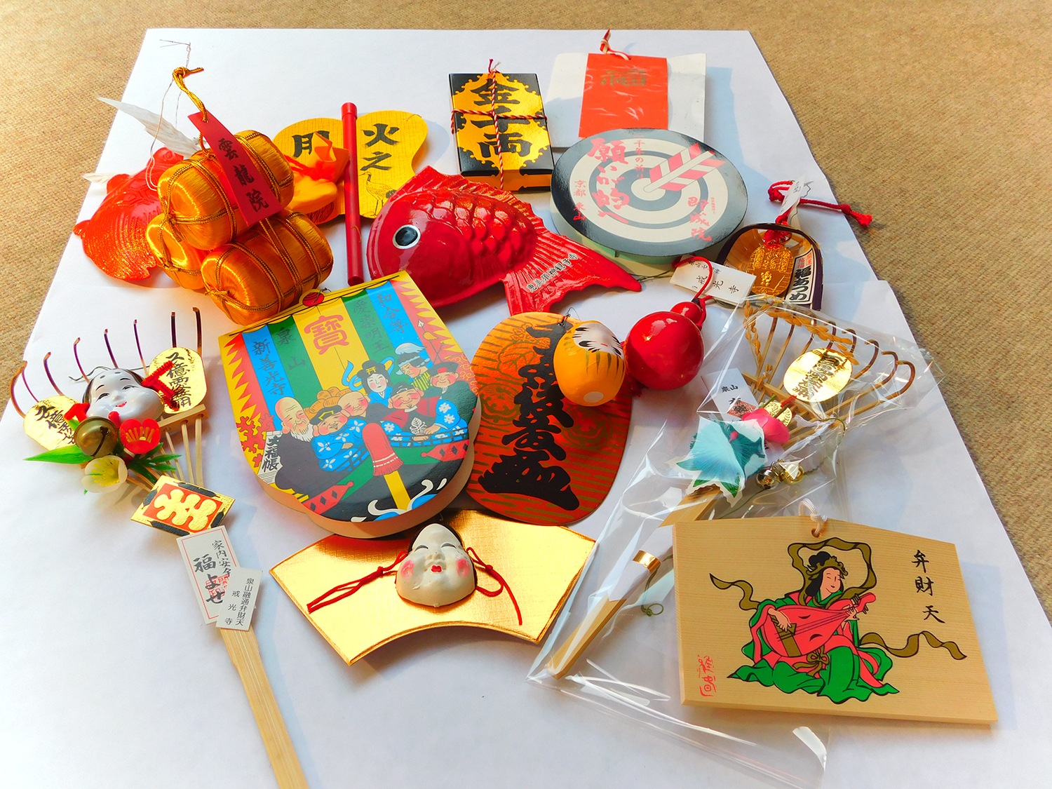 泉山七福神巡り9ヶ寺で授与される普通授与品と福笹に取り付けたセットとなります。福笹は一年中お飾りいただけるよう樹脂製の笹となっております。
